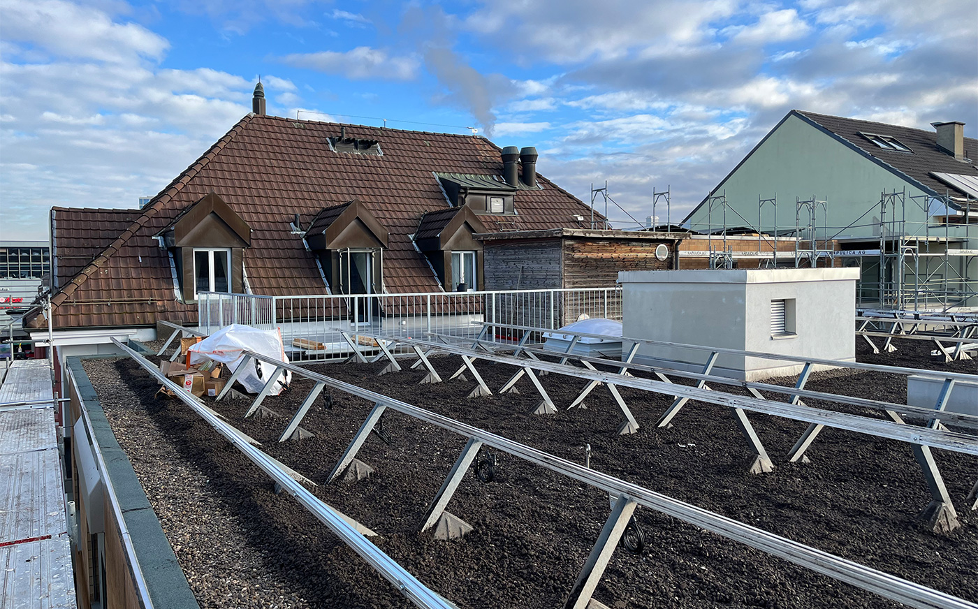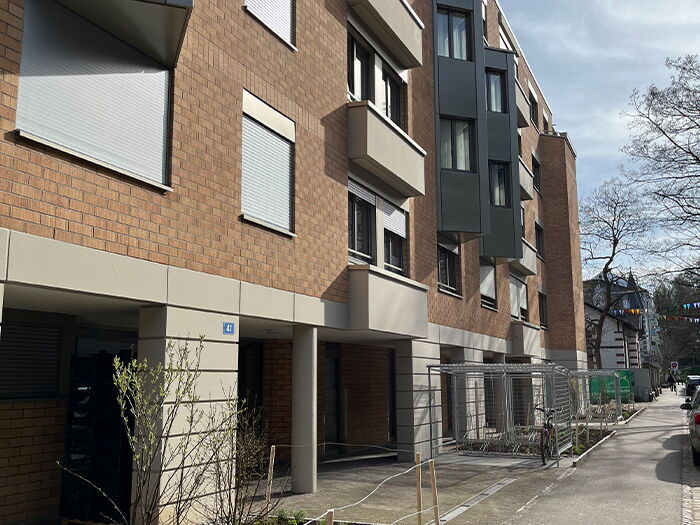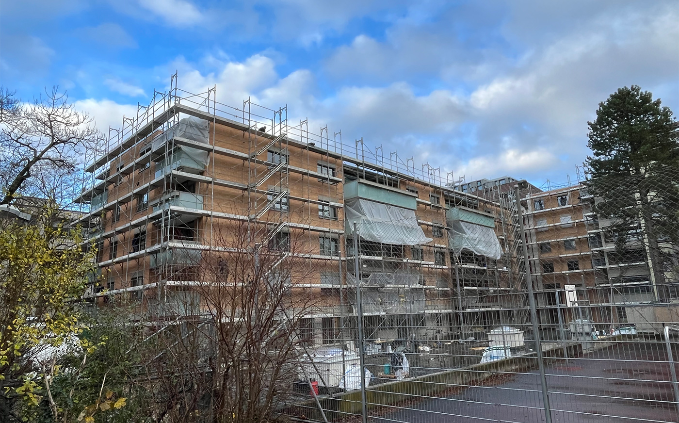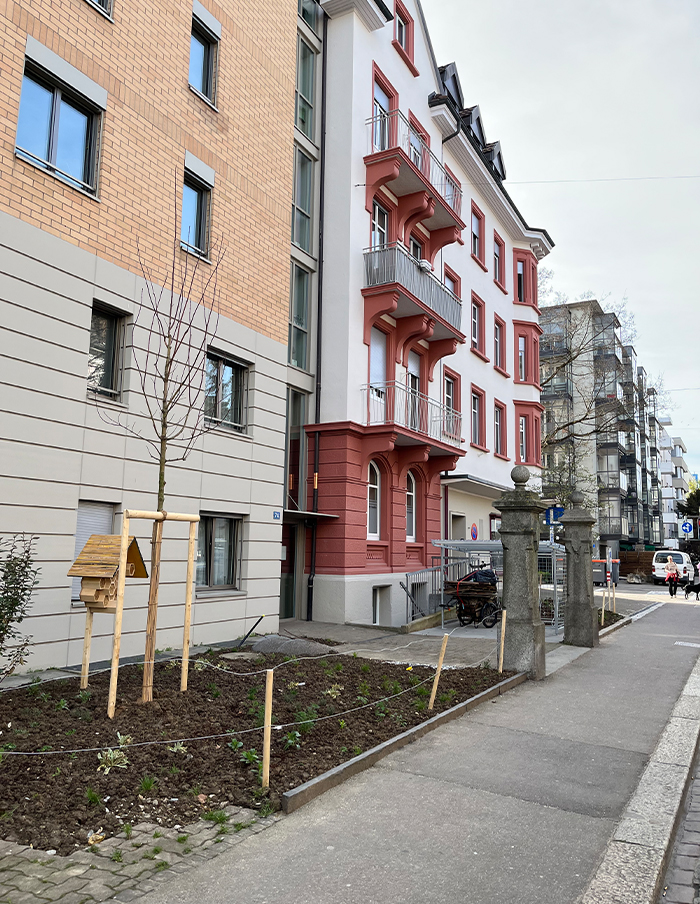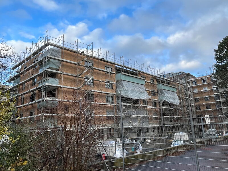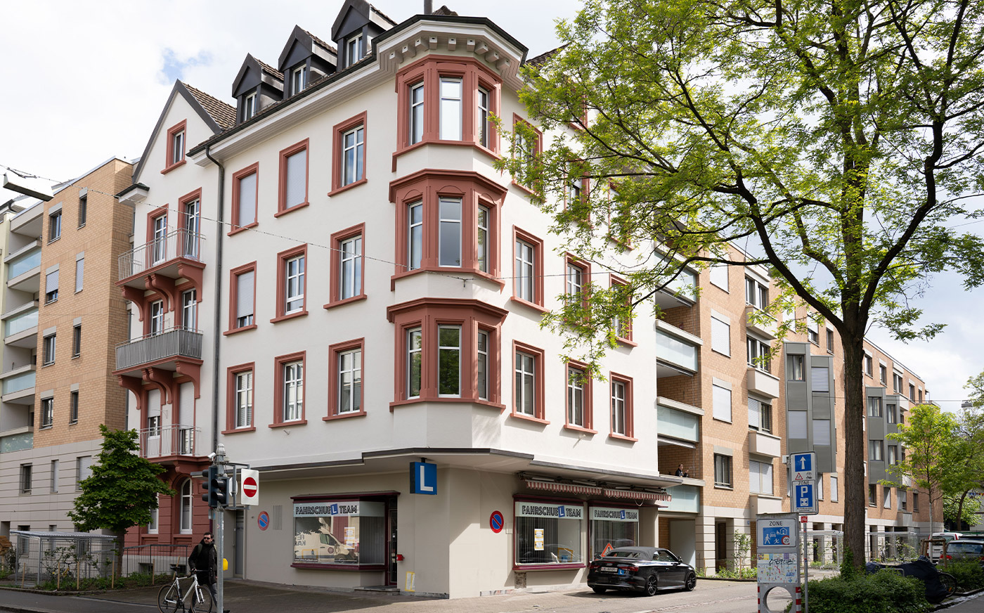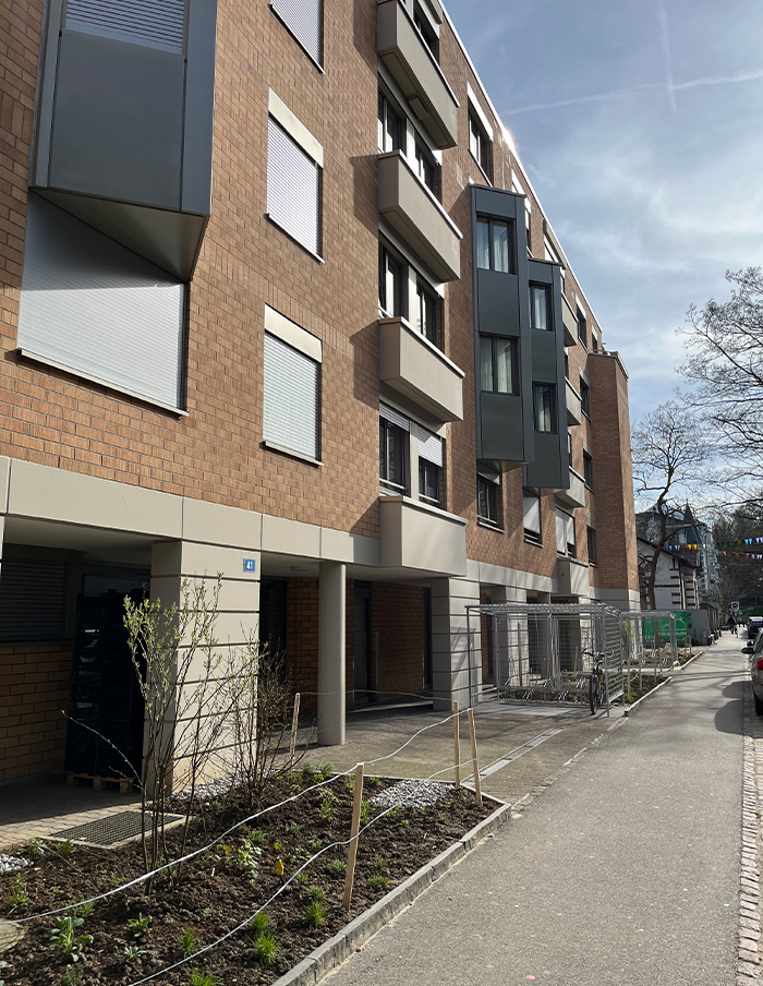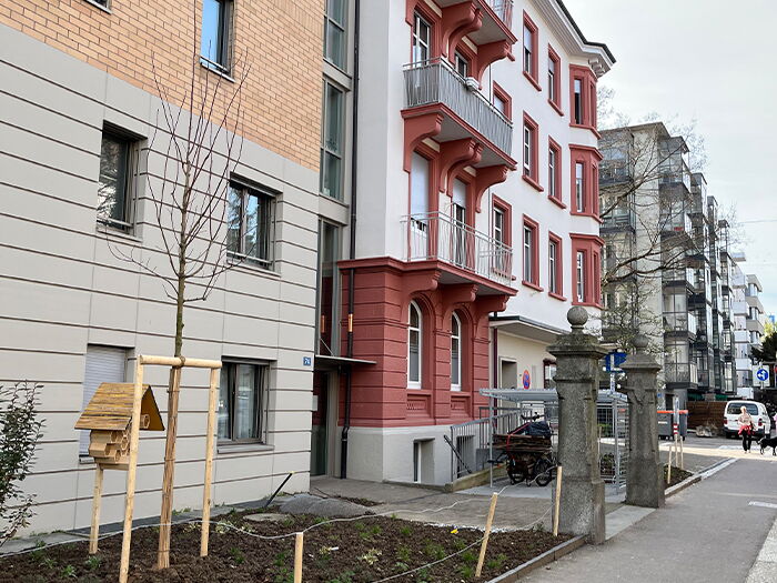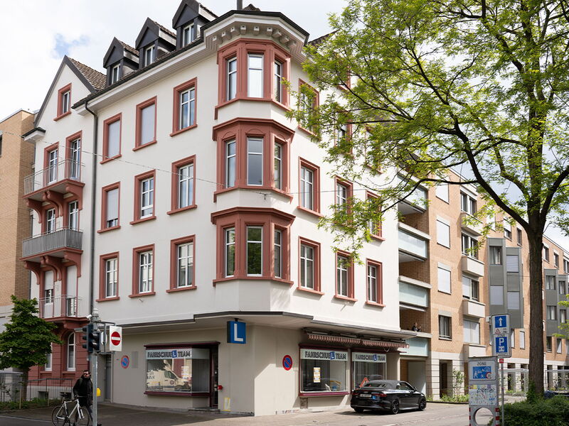 Zusammen mit der Sanierung (statische Ertüchtigung der Autoeinstellhalle wurde auch die Gebäudehülle saniert. Die bestehenden Balkone wurden umgestaltet, die Fenster und Rolläden ersetzt sowie die Flachdächer der beiden Gebäude saniert und zusätzlich eine Photovoltaikanlage auf den Dächern gebaut. Die grosse Herausforderung bei der Neugestaltung der Fassade war, den Charakter des 160 jährigen Eckgebäudes beizubehalten.